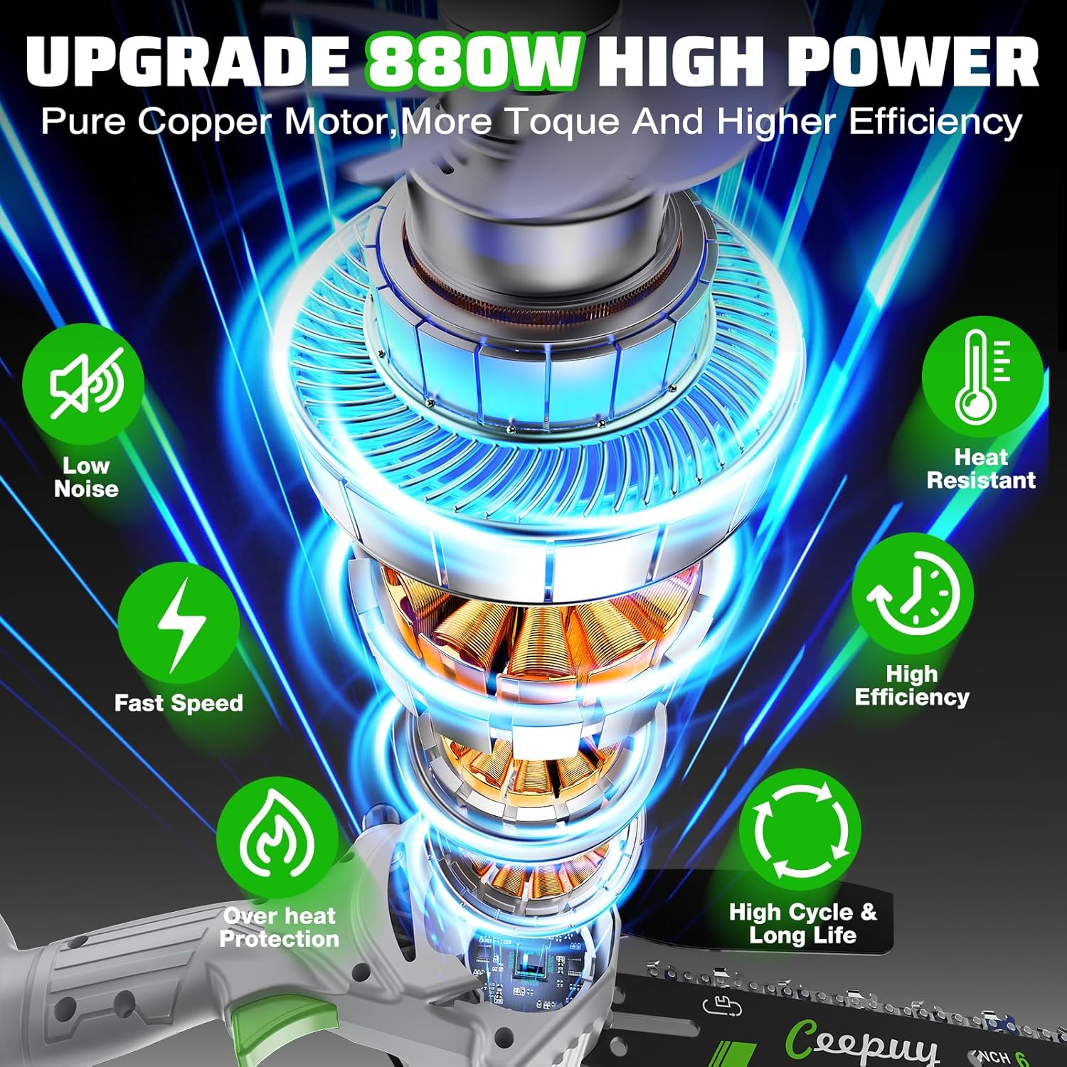 - ✔【Upgraded High-Efficiency Pure Copper Super Motor】Ceepuy 6-inch cordless mini chainsaw boasts an 880-watt high-power motor. 28.6 FT/s high speed can efficiently cut a 6-inch diameter log in just 8 seconds, significantly reducing cutting time. Ideal for both home and work, it effortlessly fells common trees or large logs with ease and efficiency.
